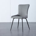 This contemporary armchair boasts a tall backrest with vertical channel stitching, curved armrests, and sleek black metal legs, harmoniously blending ergonomic support with polished design. Upholstered in smooth gray leather, its tailored silhouette injects a touch of luxury into dining areas, living spaces, or offices, uniting style and comfort effortlessly.