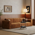 This image showcases a modern - retro sofa defined by its plush, caramel - hued textured upholstery and vertical channel tufting. The rounded armrests and streamlined silhouette blend vintage charm with contemporary comfort, making it an eye - catching centerpiece for mid - century, eclectic, or modern living spaces.