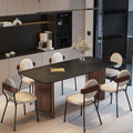 This contemporary dining ensemble marries industrial sleekness with natural warmth. The rectangular table boasts a dark - toned tabletop (ideal for sintered stone, solid wood, or concrete - effect finishes) supported by a sturdy wooden pedestal base (walnut, oak, or custom - stained wood). Six chairs feature light - colored leather seats, wooden backrests (with a circular cutout detail), and slender metal legs, blending comfort and minimalist modernity.