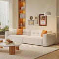 This image showcases a modern modular sofa characterized by its plush, textured upholstery in soft white, complemented by warm orange accent cushions. The clean - lined, boxy silhouette with subtle tufting merges minimalist elegance and cozy comfort, making it a perfect fit for contemporary living rooms.